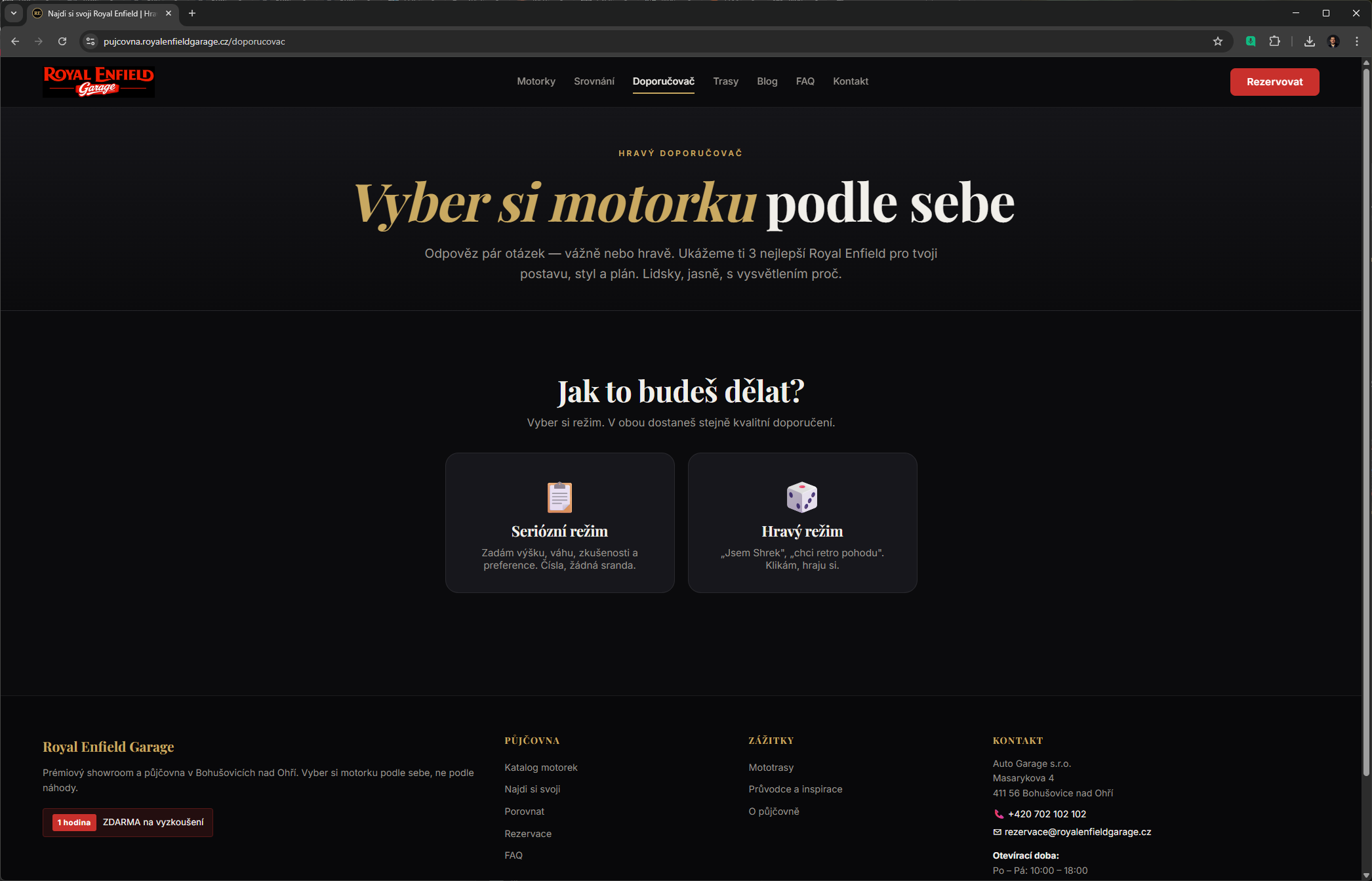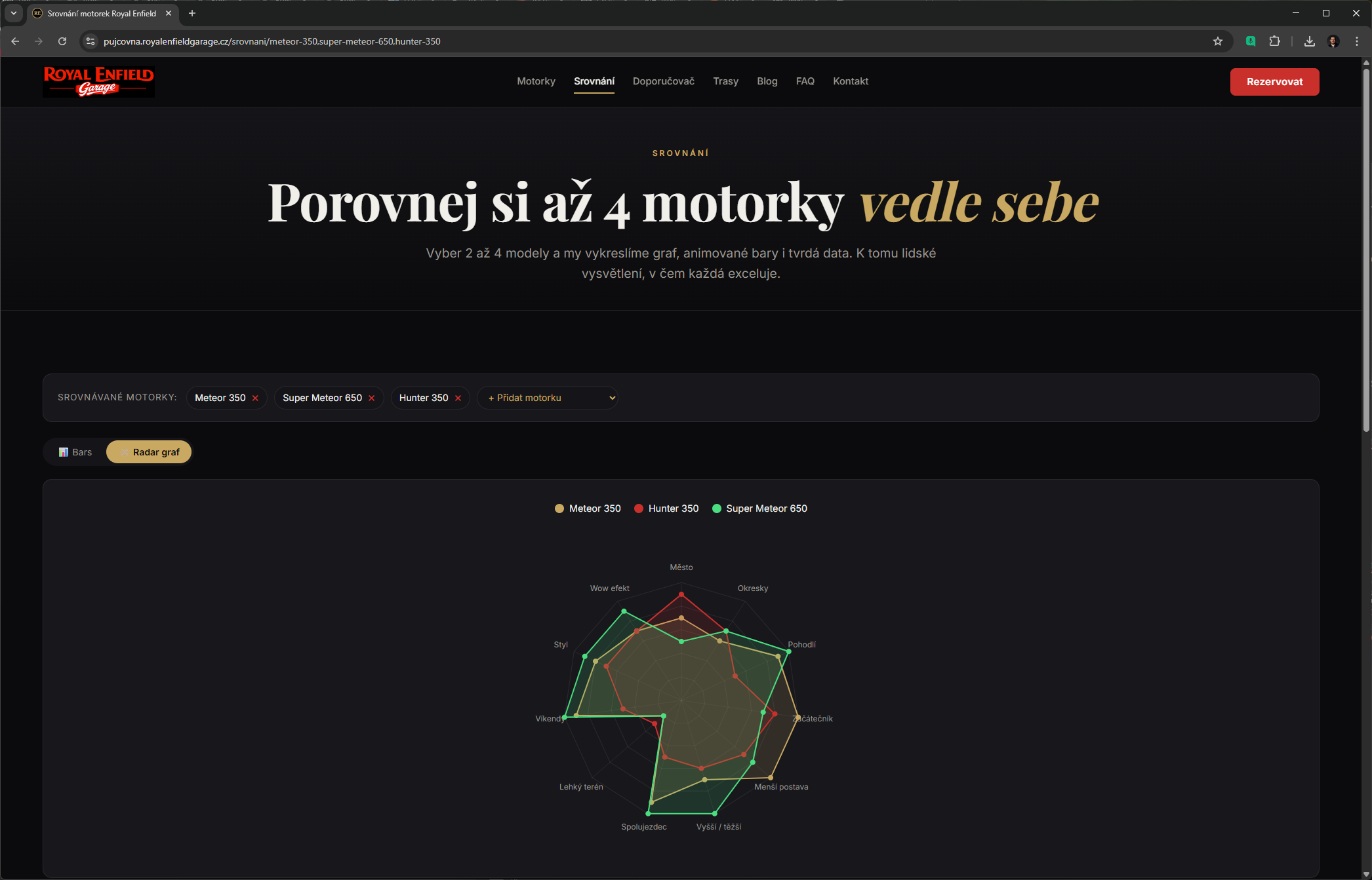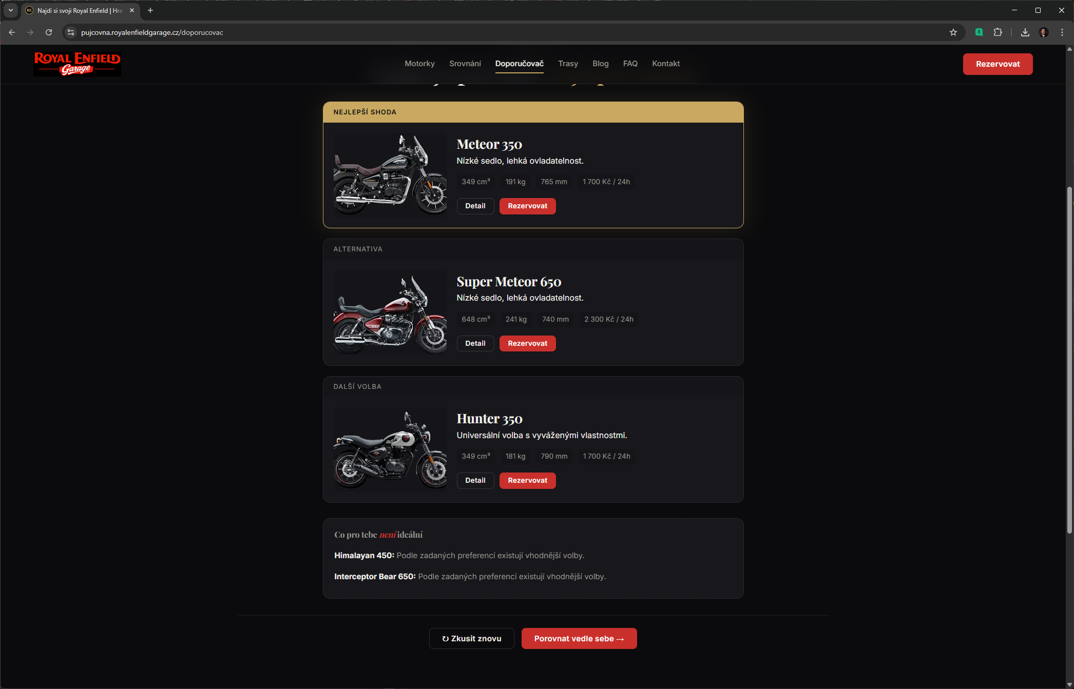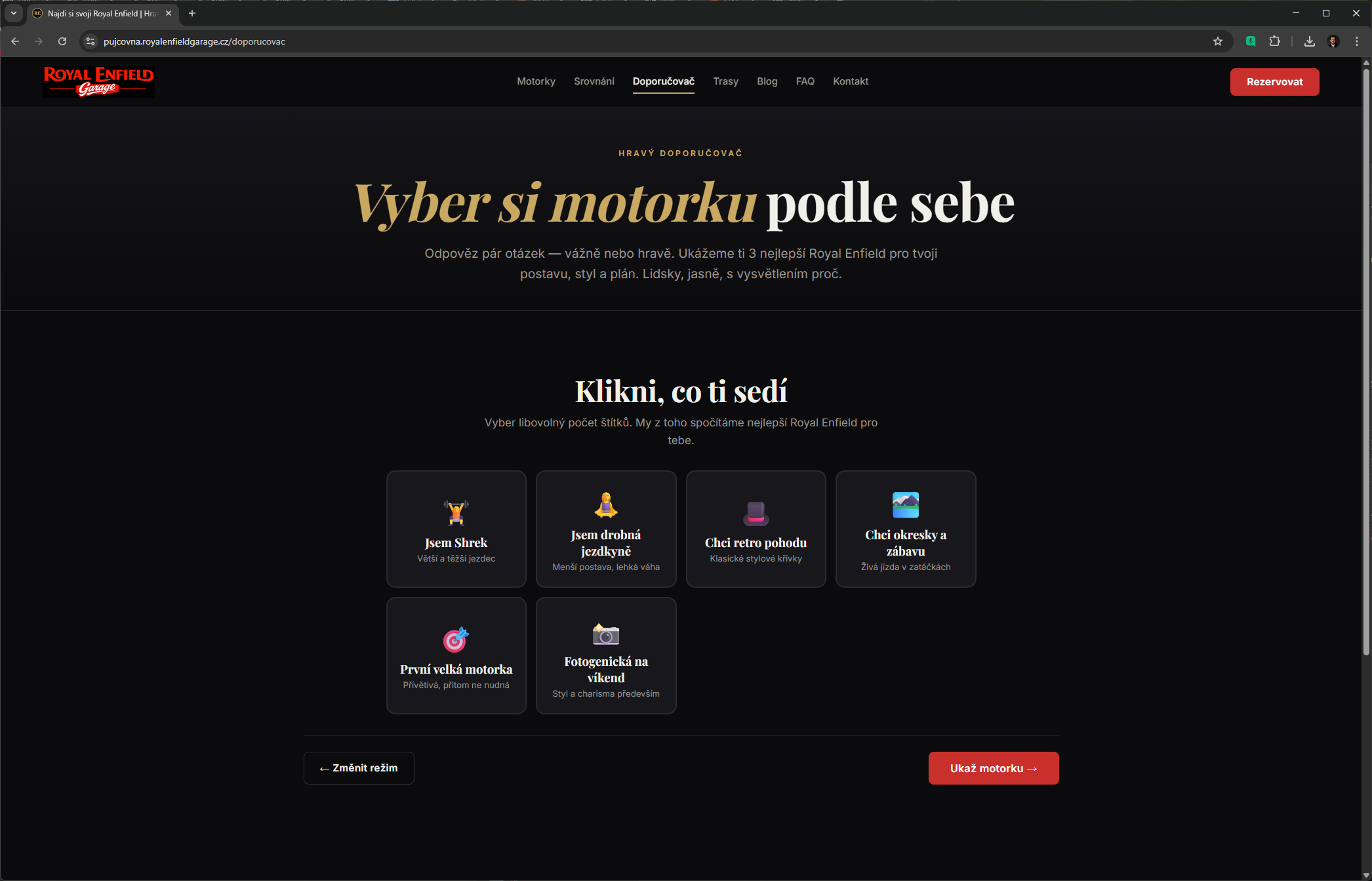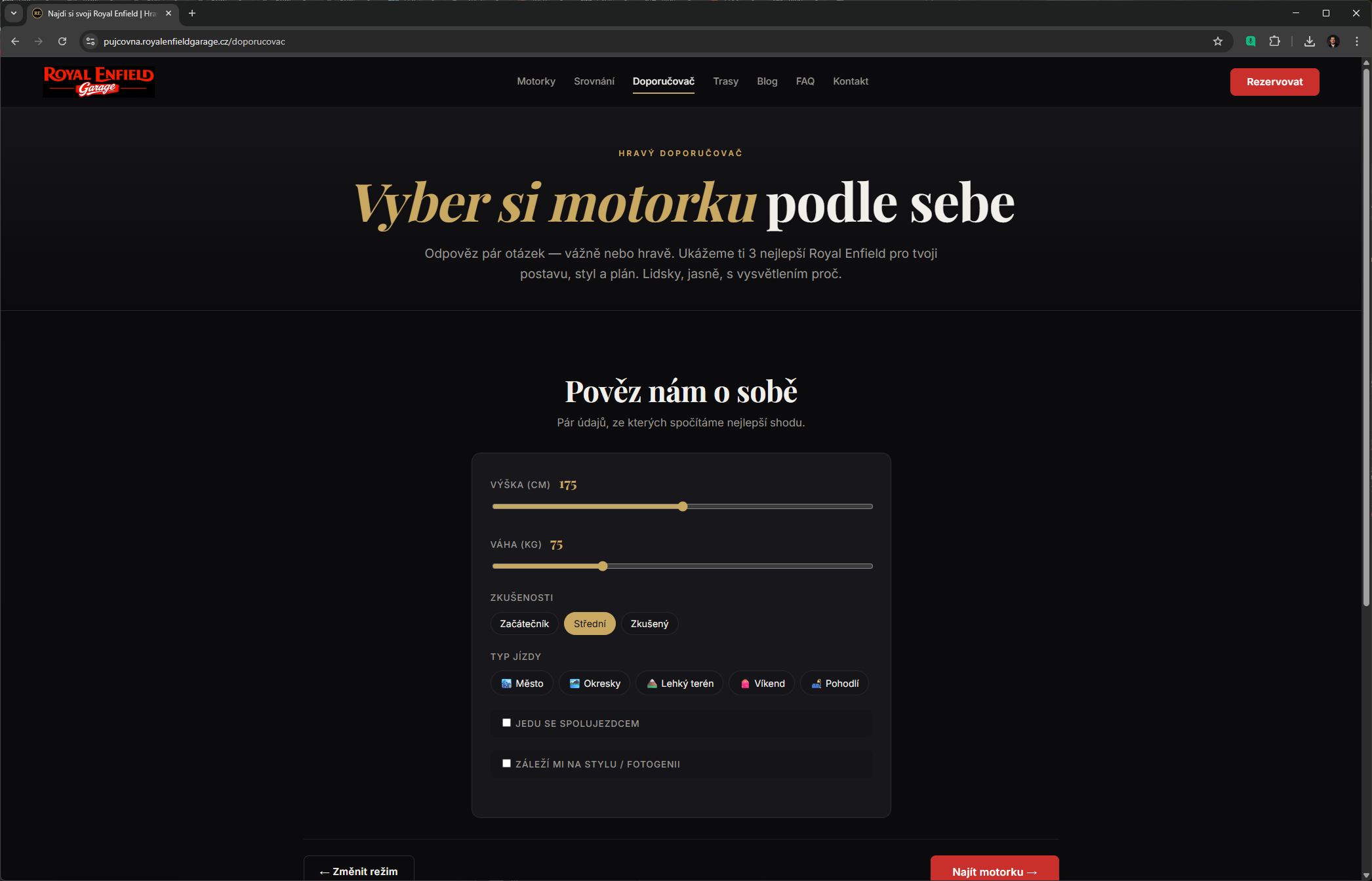 Návštěvník nepřijde jen na stránku s motorkami. Přijde do prostředí, které ho vede. Může si hrát, porovnávat, vybírat podle pocitu, podle postavy, podle zkušeností, podle stylu jízdy i podle plánované trasy.