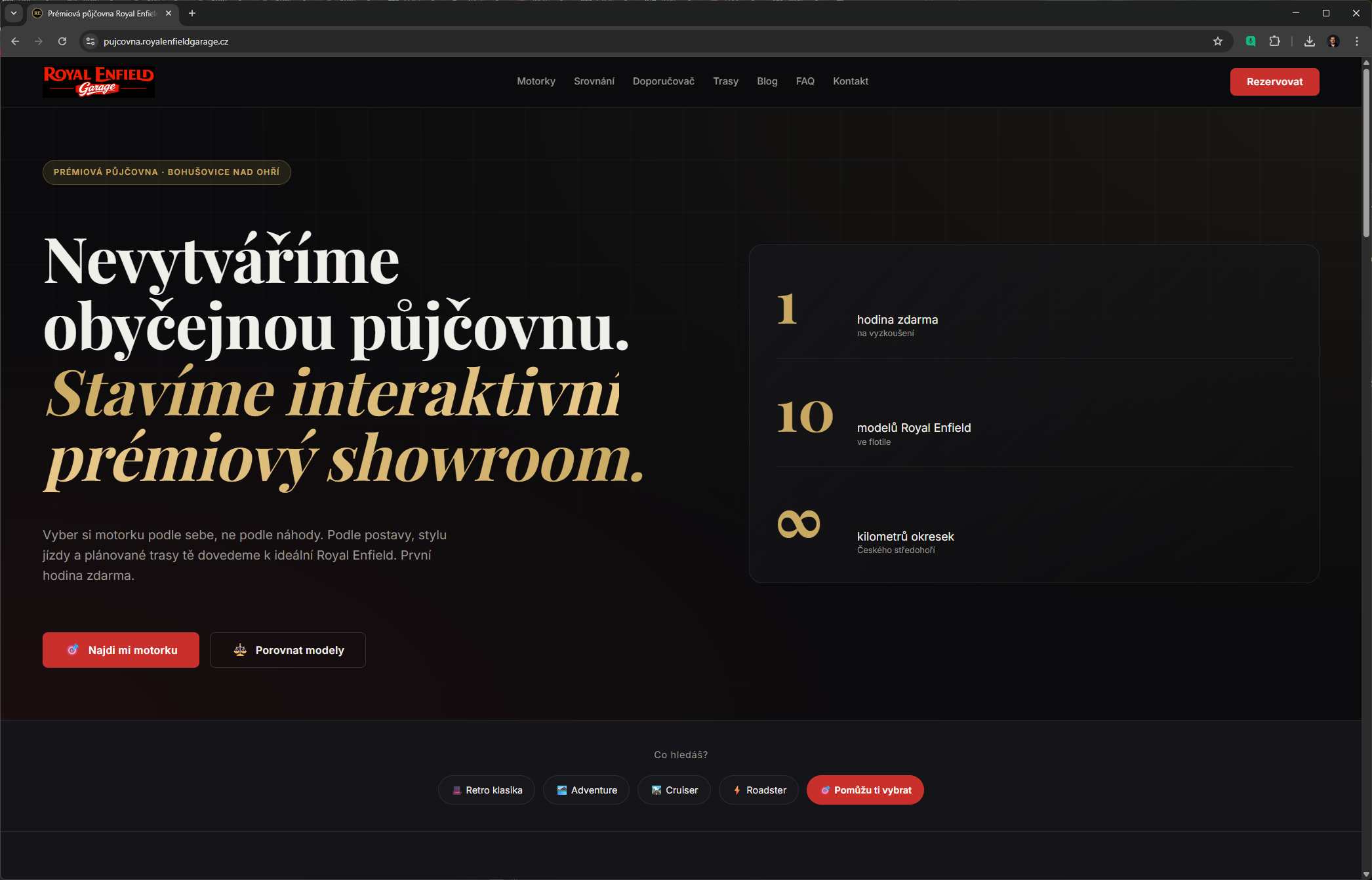 Navrhl jsem půjčovnu jako interaktivní prémiový showroom, ne jako obyčejný seznam motorek.